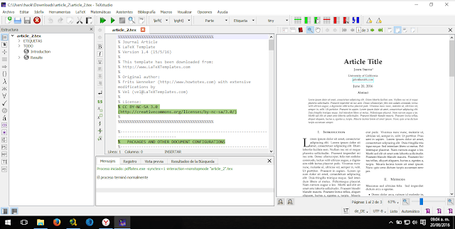 Al instante comenzará la compilación, al costado izquierdo les visualizará los resultados de la compilación. Si quieren ver el pdf por separado, basta con ir al directorio donde están los archivos del documento. Ahí encontrarán el archivo pdf con el mismo nombre que el archivo .tex.